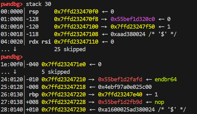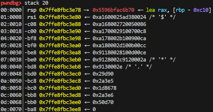 在 load 函数中, *s 作为第二个参数,该指针与 rsi 重合。而这些参数都在栈上,所以可以在栈上找 libc 相关地址(0xFFF 范围内),从而推算 libc 基地址。