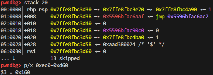 libc_start_mainpop rdi; ret/bin/shretsystem的偏移地址,这些数据都在一开始跟上面的所有指令代码一起被存放在栈上,于是可以前面的指令读取到。0x160 是怎么来的?因为栈空间都在相邻区域内,如图,第一张图是 main 函数读入完我们的 opcode 后的栈分布,第二张图是 load 函数里面的栈分布,load 函数[k] = s[[i] + j]这个s实际上就是rsi为开始地址的,减一减就能得到两个地址相差 0x160,也就可以通过 load 读到我们在 opcode 中就写好的偏移地址了。
