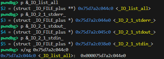 可以看到 _IO_2_1_stderr_ 、_IO_2_1_stdout_、_IO_2_1_stdin_ 都是包含 vtable 的 _IO_FILE_plus 结构体,并且从 _IO_list_all 开始通过链表(_chain 字段)依次串联起来。