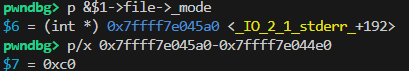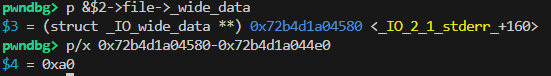 *(size_t *)(stderr2 + 0xc0) = 1; // 伪造 _mode,目的是启用 _wide_data 模式