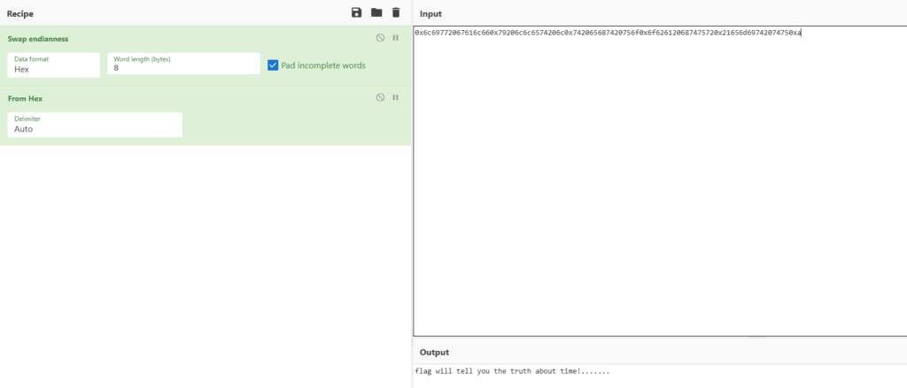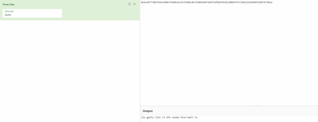 hello 0x6c69772067616c660x79206c6c6574206c0x742065687420756f0x6f626120687475720x21656d69742074750xa ,your file read done!
