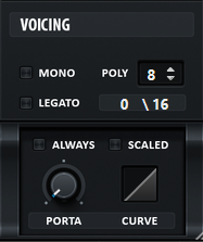 SCALED:Porta Scaled,滑音速度比例缩放,让滑音的速度不再是固定值,而是根据两个音符之间的音程距离自动调整。开启后,你设置的 Porta Time 对应的是跨一个八度的滑音时长,这样滑音速度会按比例适配所有音程。