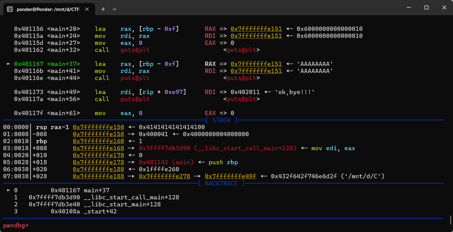 记录一下本次的痛点:因为栈溢出时输入点到溢出点的距离与预测不一致需要调试确定,然后看到如下界面: