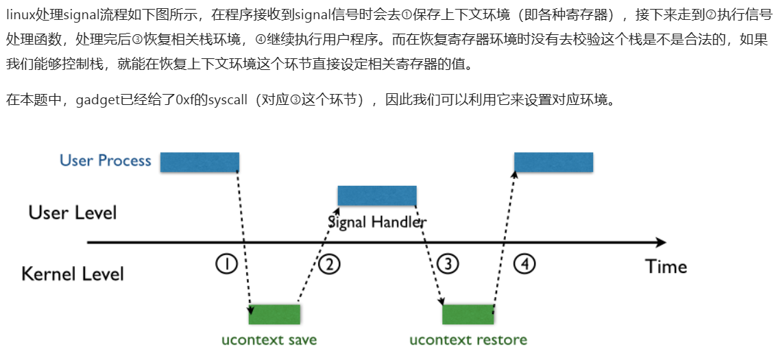 题目还送了我们一个 gadgets:mov rax, 0xf , 这样就可以利用 sigreturn 的系统调用。