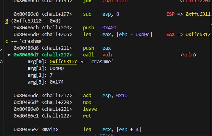 si 进入 vuln , info r 查看 ebp 的情况,search “crash” 可以查到我们 payload 填入的位置,计算差值可以得到我们填入的位置离 ebp 差了 0x16 而不是 0x32. 后面就好办了,那么大一块空间一看就是让你写 shellcode 的。